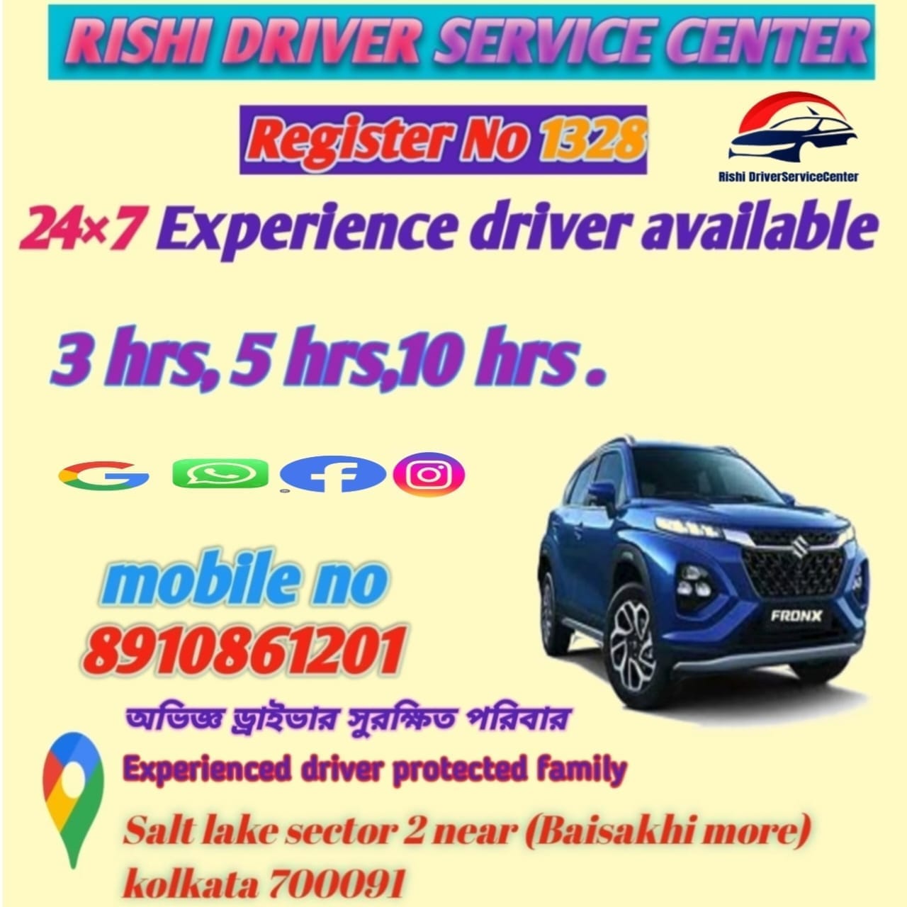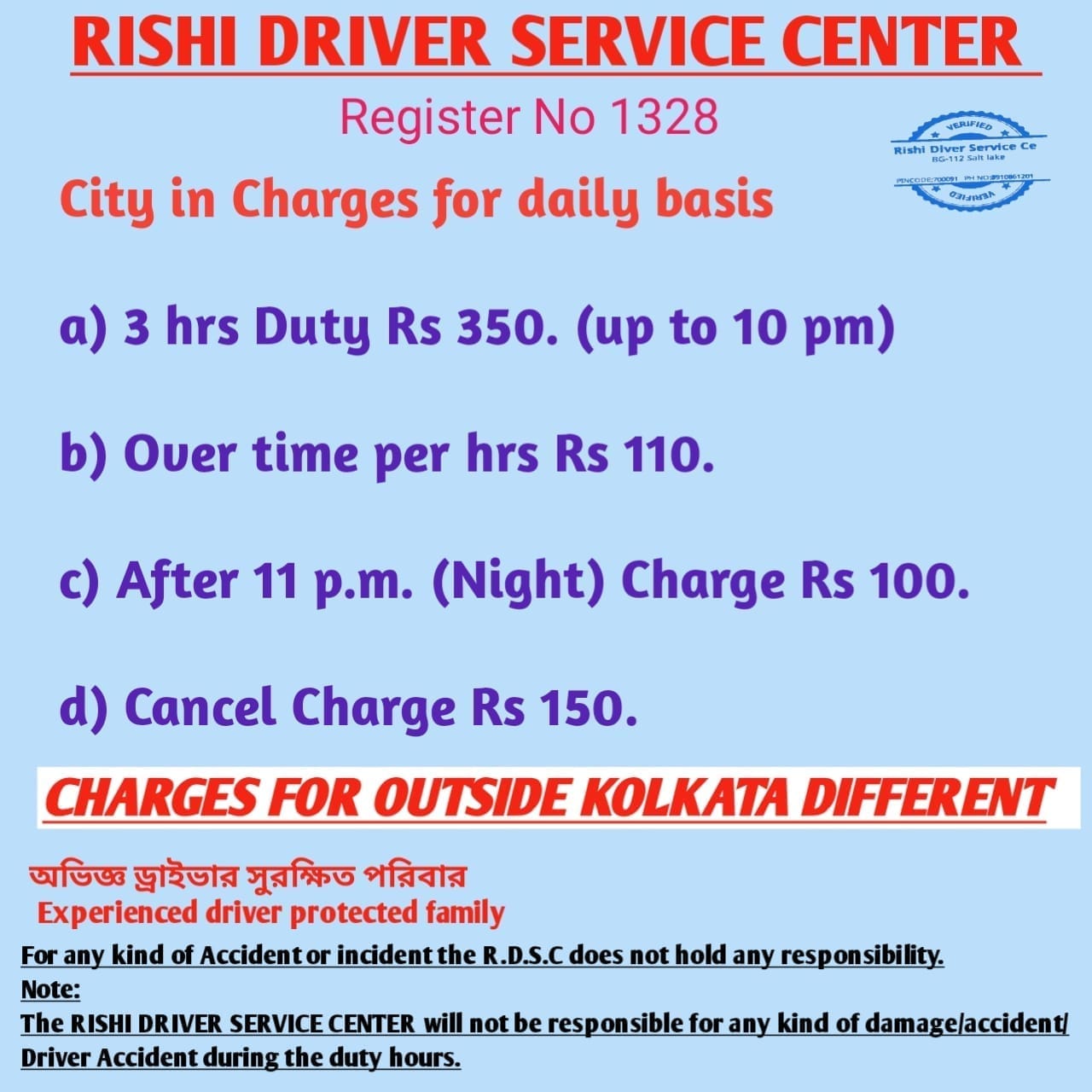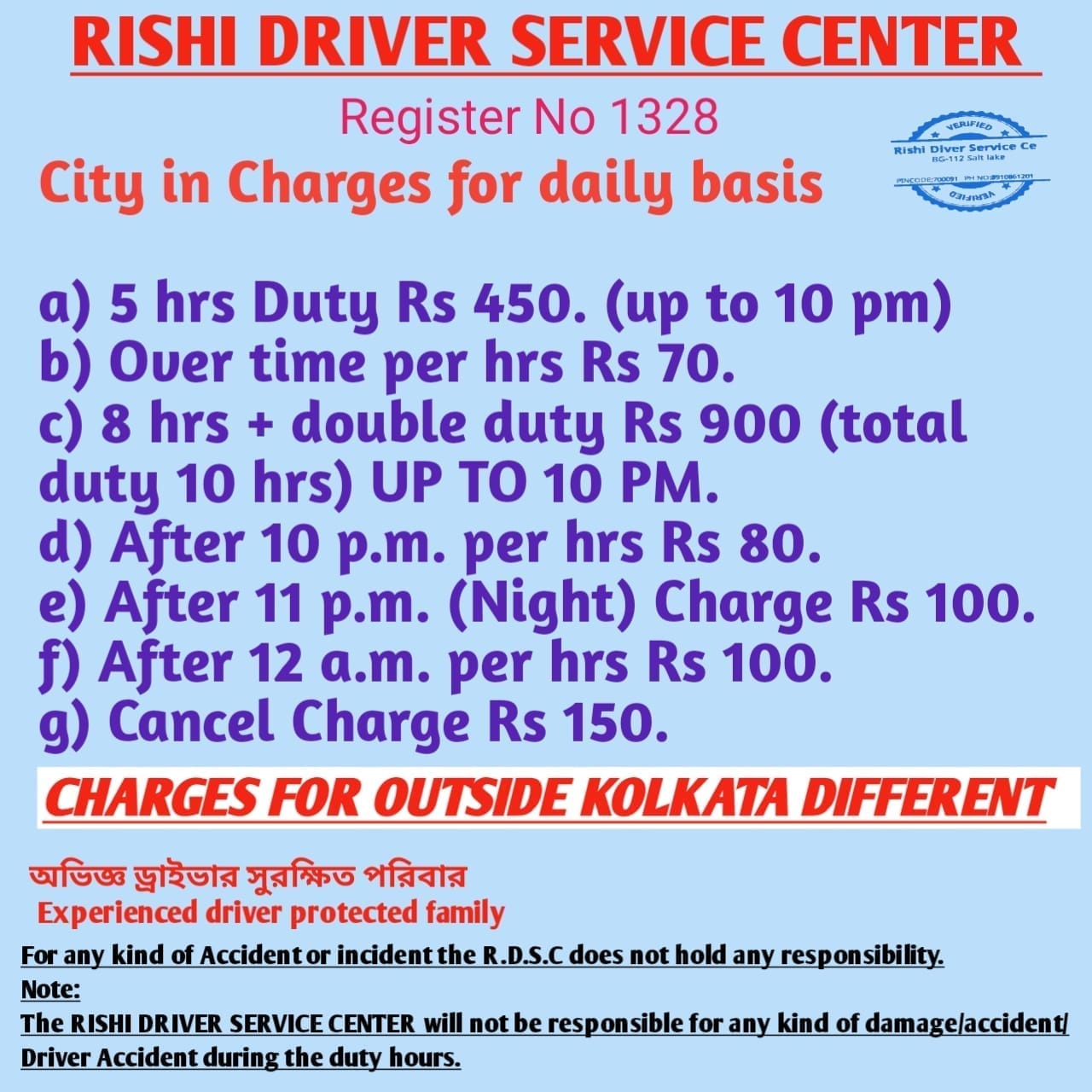 Rishi Driver Service will not be responsible for any kind of damage / accident / driver accident during the duty hours.